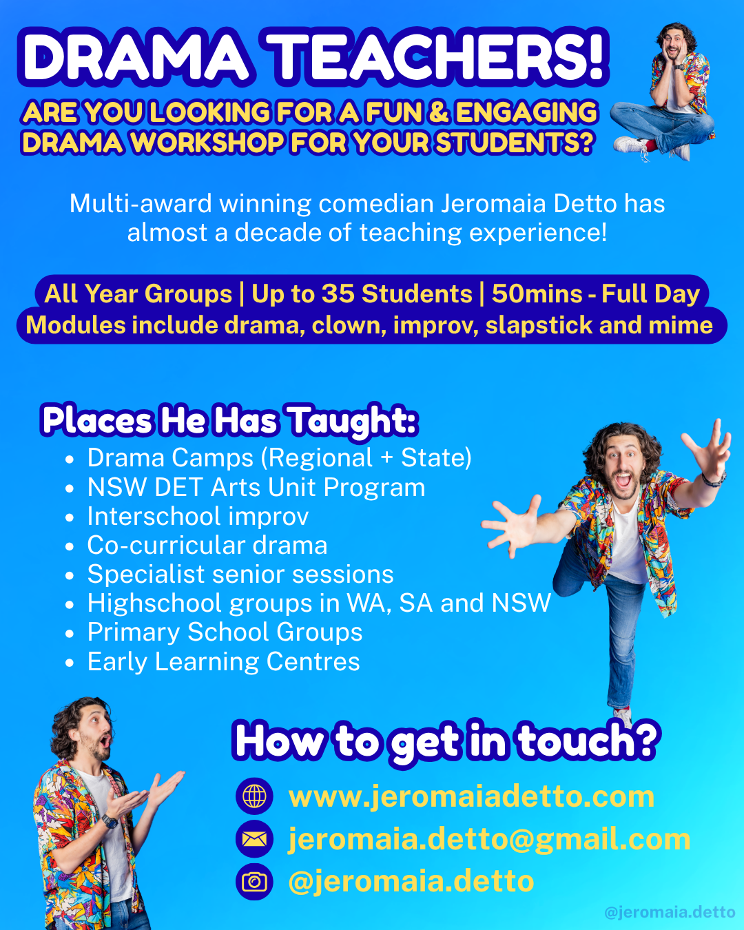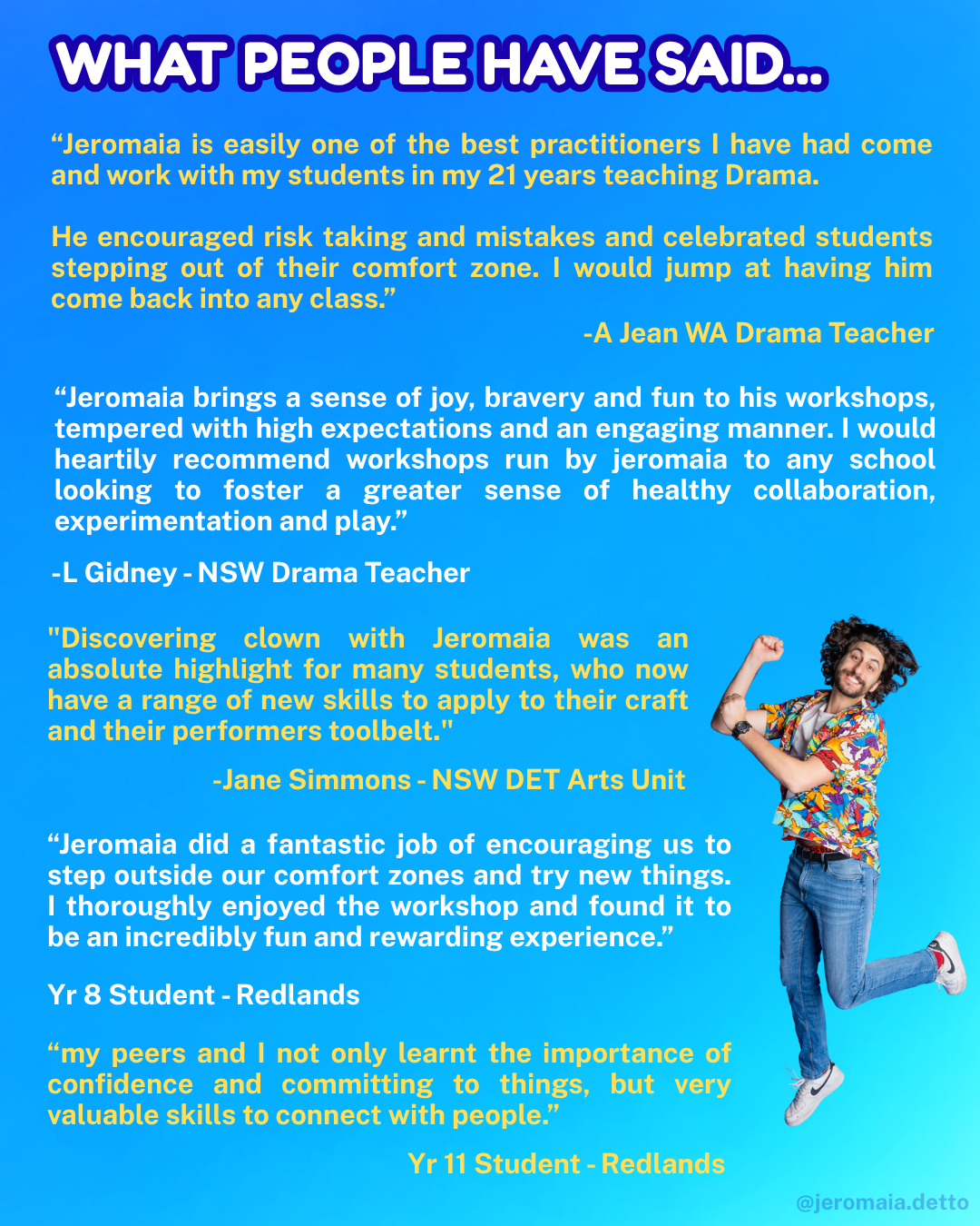 He has studied in Sydney, London, Oslo and Chicago, as well as being a graduate of acclaimed French Theatre and Clown school, Ecole Philippe Gaulier. Since 2017 Jeromaia has sold out workshops across Australia and Europe as well as working with corporate and academic groups.
